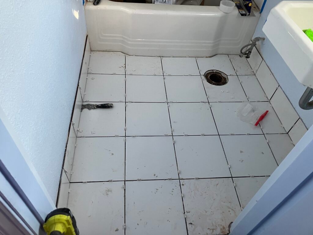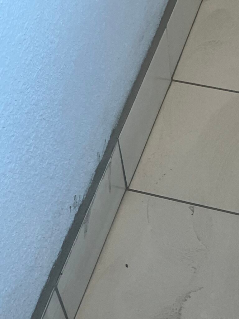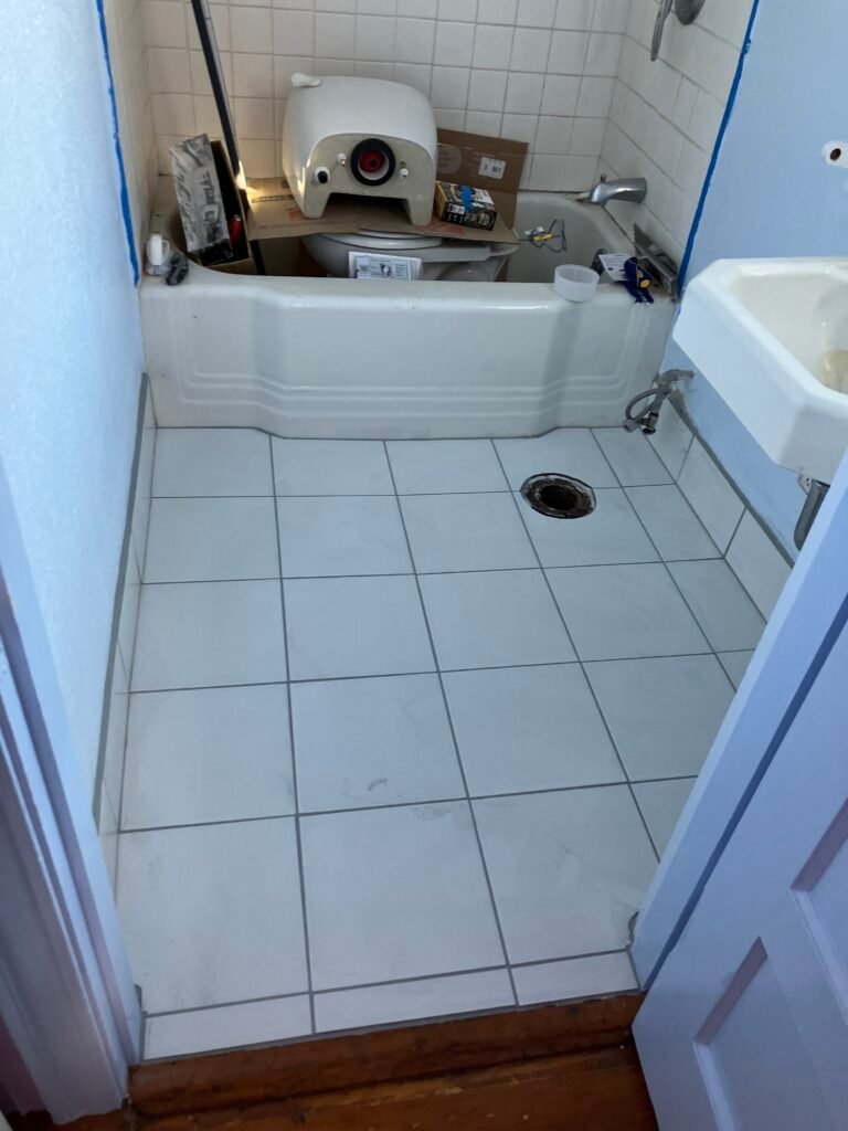 Older homes settle, which means uneven walls and non-planed floors, and out-of-square corners. This is tricky for tile. This client wanted a tile baseboard. I ended up free-handing the toilet drain opening cut with a black widow blade on the angle grinder. I used a polymer-modified mortar, which was sufficient for the baseboard. Because these had to be bedded-out, floated from the wall, to be straight against a wavy wall, I used dollops of that mortar, and back-filled with grout a bit. They’re sturdy. Lastly, this Daltile was not the highest-end, and the cross-section was terracotta color. So, I built a berm or half-mitered joint on the top, to conceal that edge.