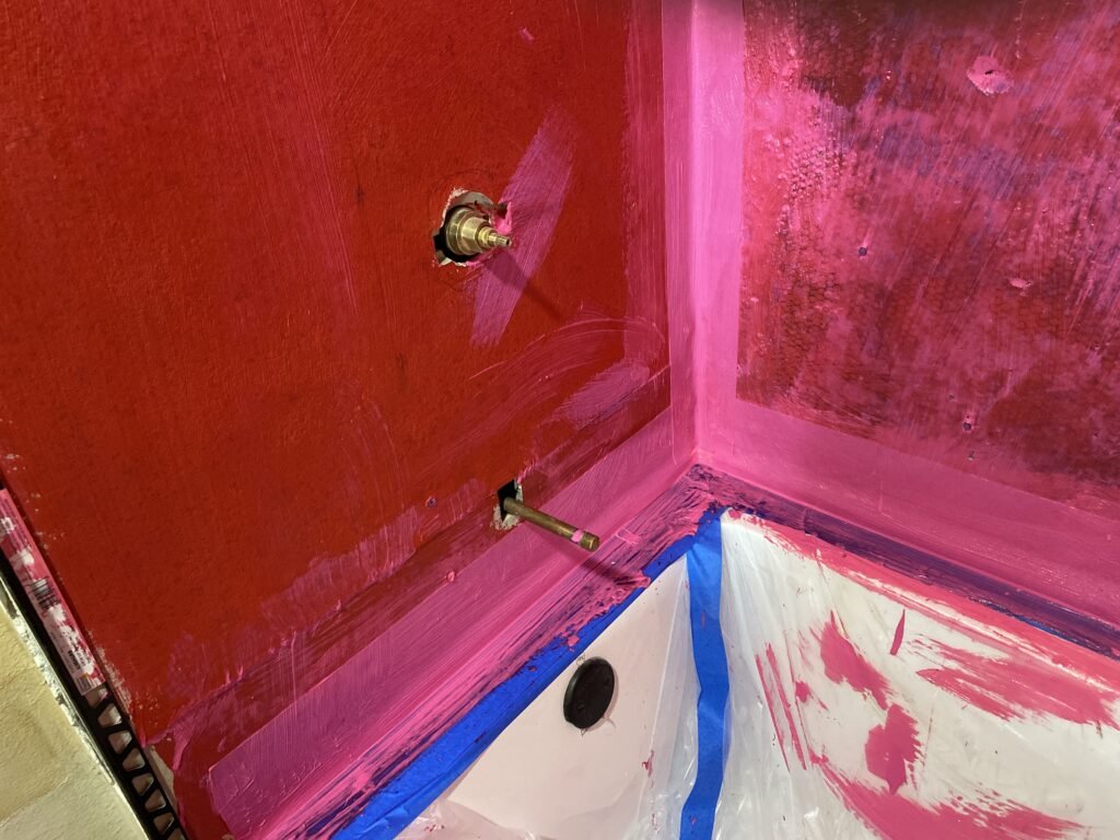 This was a straightforward job. Until I realized I had not checked the slope or fit of the tub. The tub was about 1″ too small for the footprint. After backer board is installed, the lip of the tub should abut the walls, and after a bed of mortar is put in (everywhere but that …