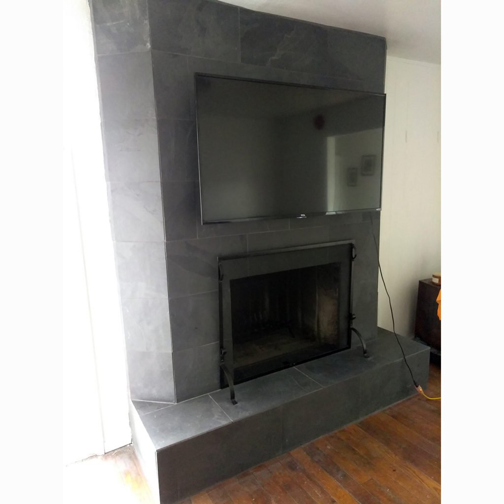 This was faux slate ceramic tile, which was chosen not for cost but texture and size. These are each 36″ long, making a 6′ wide hearth.