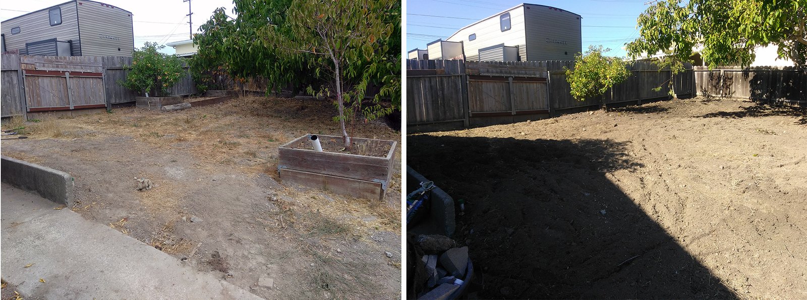 After emptying the sheds, we listed a lot of items on craigslist (lockers, awnings, sheds, lumber). Trimmed back the trees. The soil was initially too hard for a tiller, so we had to soften the earth with water for a few days, and make the till depth skid more shallow (about 5″).
