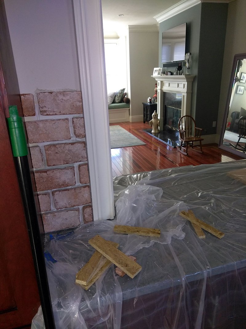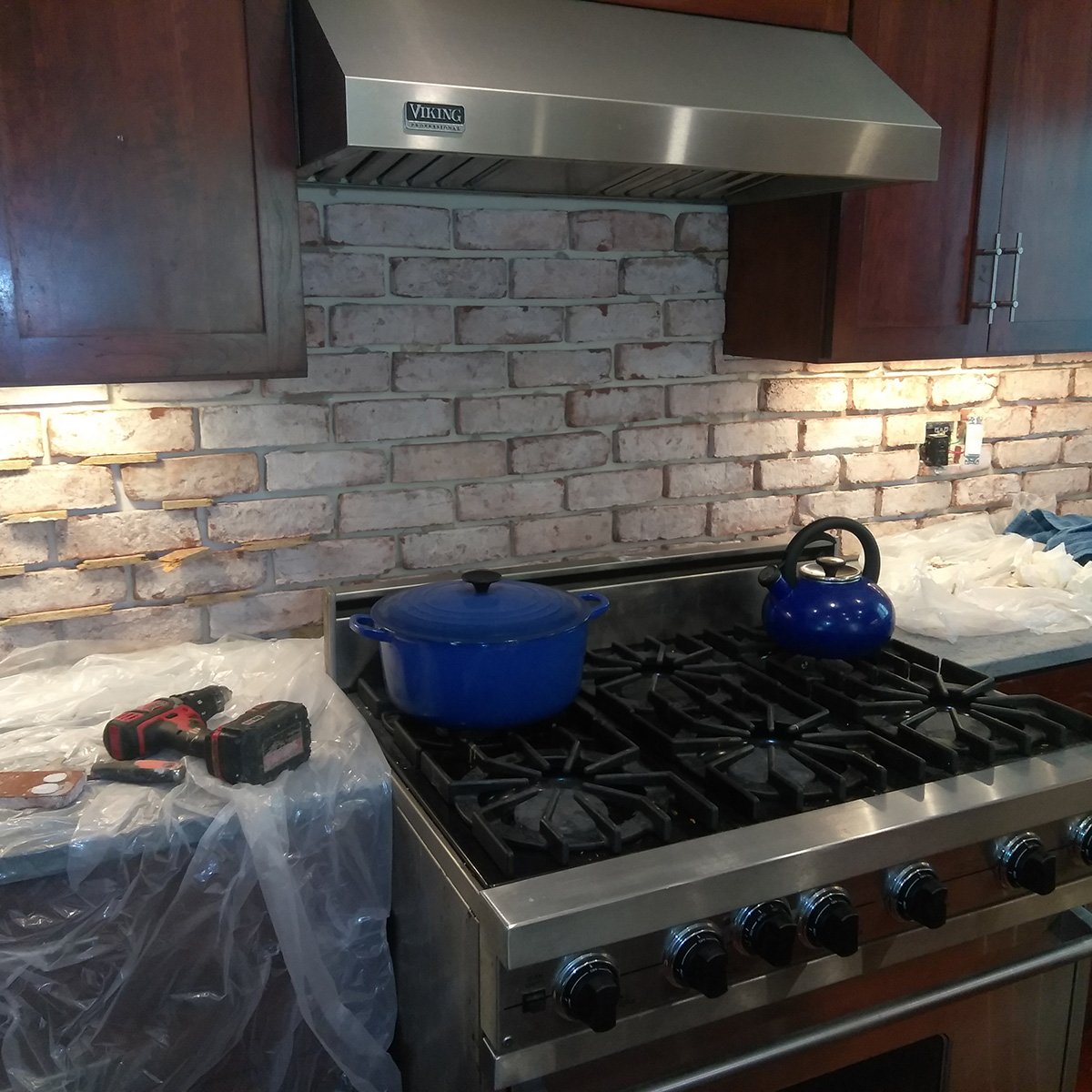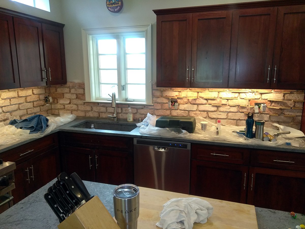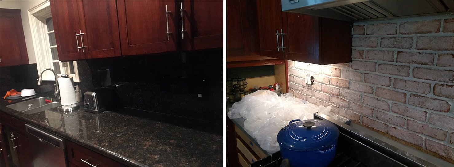Attention! Don’t use gray mortar to get a ‘bleached’ look with whitewashed brick kitchen backsplashes. You want to use mortar, and you need to use a grout bag. For this kitchen in San Francisco, the cabinets will eventually be painted white. Counter tops went from granite to soapstone. Brick back-splash will add a nice touch. The goal was to brighten the room.